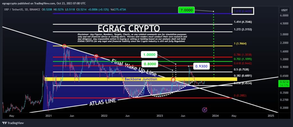 At the moment, the XRP worth sits at round $0.52. Because the analyst reveals within the chart, XRP has skilled a retest of the development line and handed it with flying colours. Specifically, Egrag additionally factors out that XRP was capable of keep above the 0.236 Fibonacci retracement degree at $0.4534.