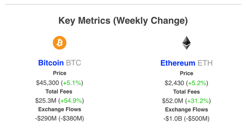 Bitcoin (BTC) additionally flowed off centralized exchanges, clocking $300 million price of internet outflows and breaking an eight-week development of inflows onto exchanges. Bitcoin’s community charges spiked by greater than 50% this week as properly.