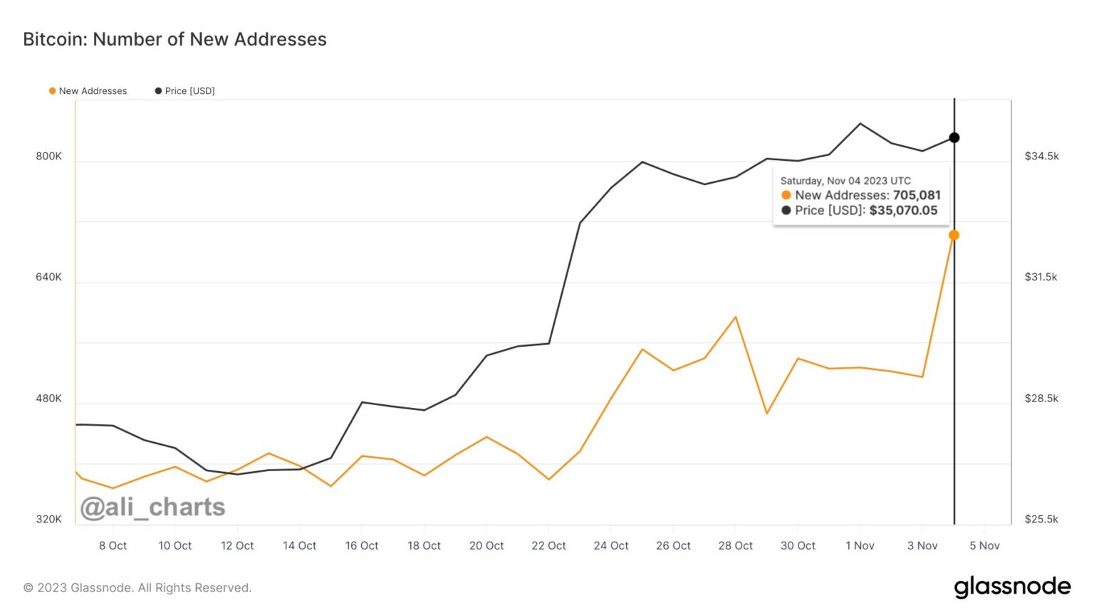 “Bitcoin: greater than 700,000 new BTC addresses created [on Sunday] alone. This is a crucial milestone, as BTC community progress is [one of] the most effective value predictors!