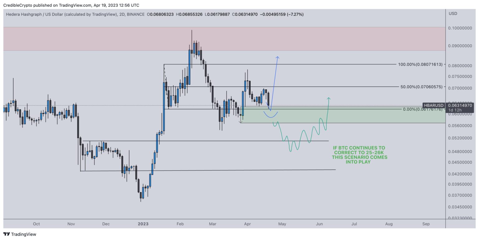 “BTC should maintain $28,000’s for HBAR to carry this stage as properly. If not, could get an opportunity at some $0.0500 HBAR once more. I wouldn’t be promoting HBAR at these ranges for an opportunity at .05 that will by no means come. Nevertheless, I’d be setting bids between $0.0500-$0.0600 so as to add to identify holdings in case we DO get that likelihood. Larger timeframes nonetheless exceptionally bullish so within the grand scheme of issues that is noise (until you’re actively trying to find spots so as to add to your holdings).”
