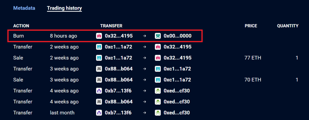 Whereas going via the unfamiliar strategy of wrapping NFTs, Riley by accident despatched the asset to a burn tackle — which completely deleted the NFT from circulation, as proven beneath.