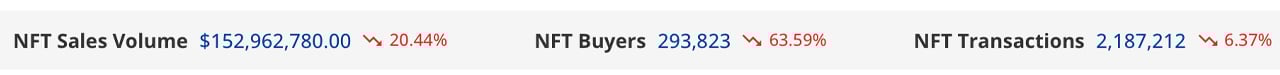 Gross sales of non-fungible tokens (NFTs) have nosedived greater than 20% over the previous seven days in comparison with the earlier week. The decline follows a number of consecutive weeks of positive aspects, throughout which Bitcoin (BTC)-based NFTs gained vital prominence. Within the final seven days, NFT gross sales totaled $152.96 million, and the variety of NFT patrons decreased by 63.59%. Ethereum-based NFT gross sales accounted for $84 million, representing 54.91% of the market share amongst 21 completely different blockchains.