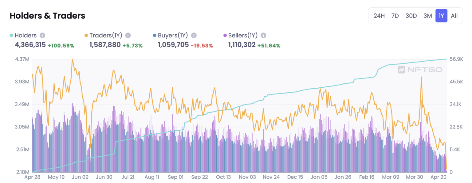 In accordance todata from the analytics platform NFTGo, there have been solely 7,907 consumers on April 26, whereas there have been 8,641 trying to promote their NFTs.