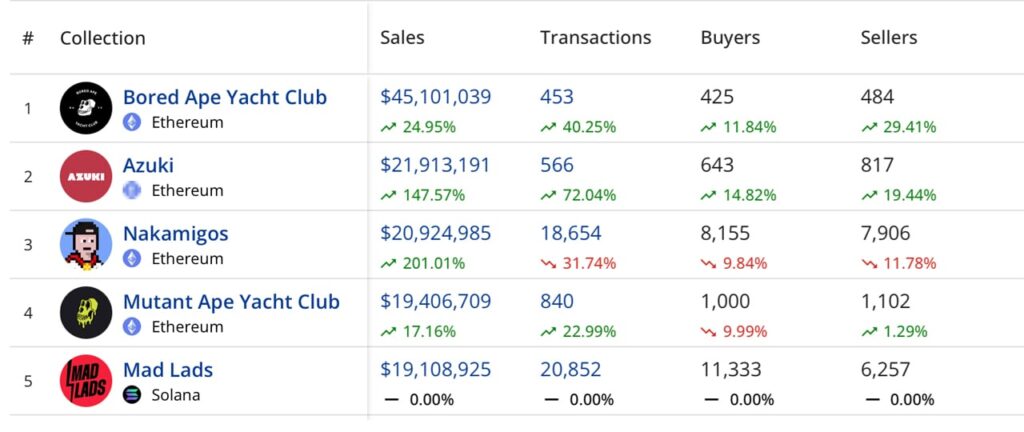 Through the month of April, Polygon witnessed a surge in gross sales by 22.75%. In the meantime, Arbitrum, the sixth-largest blockchain when it comes to NFT gross sales, noticed gross sales spike by 78.35%, amounting to $10.29 million. By way of NFT collections, Bored Ape Yacht Membership (BAYC) emerged because the chief with $45.10 million in gross sales.