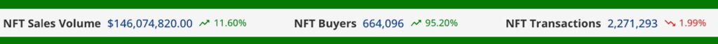 Regardless of a slight dip of 1.99% within the variety of NFT transactions, which amounted to 2,271,293 final week, there was a surge of over 95% within the variety of NFT patrons. Statistics present roughly 664,096 patrons have been recorded up to now seven days.