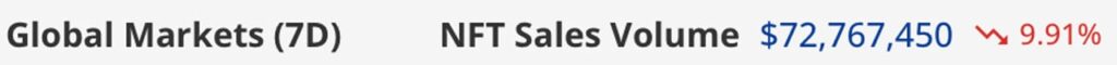 Gross sales of non-fungible tokens (NFTs) have slid as soon as extra this week, dipping to 9.91% beneath the previous week’s figures. Knowledge reveals that within the span from September 24 to October 1, 2023, round $72,767,450 value of NFT gross sales have been logged, marking the newest seven-day stretch.