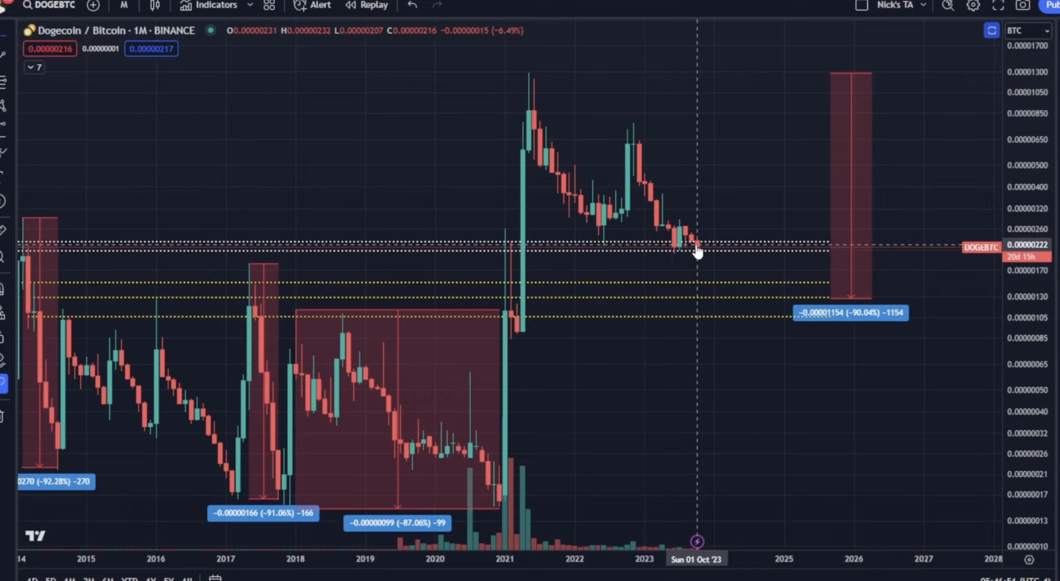 Merten is anticipating a roughly 90% correction, which might imply DOGE/BTC would discover its market backside round 0.00000130.