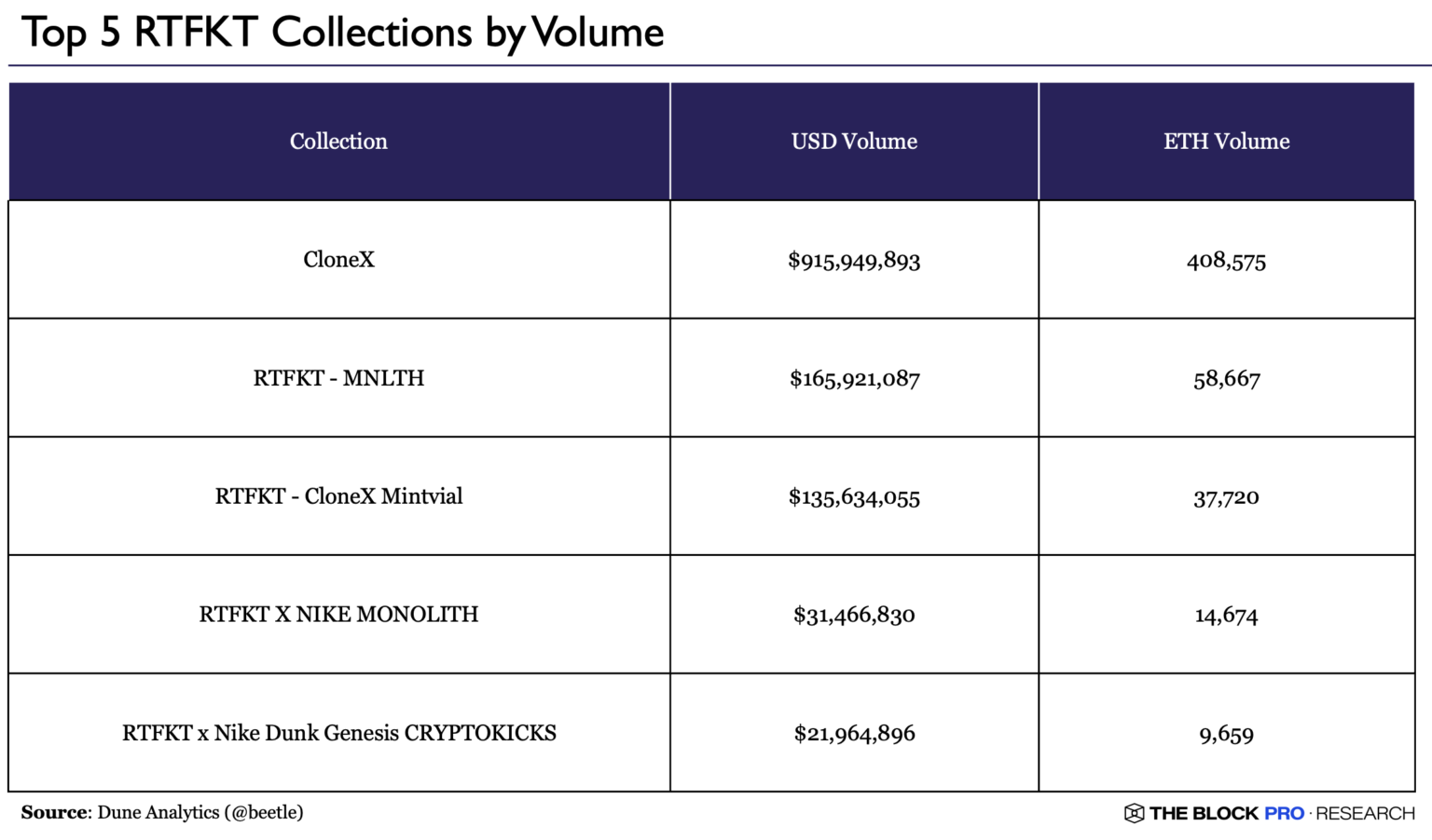 Since December 2021, Nike-RTFKT NFTs have spurred near $1.4 billion in buying and selling quantity, in response to The Block Analysis information. On the identical time, RTFKT’s greater than two dozen whole collections, together with the CloneX-Takashi Murakami avatar NFT drop of late 2021, have earned $170 million, in response to DefiLlama.