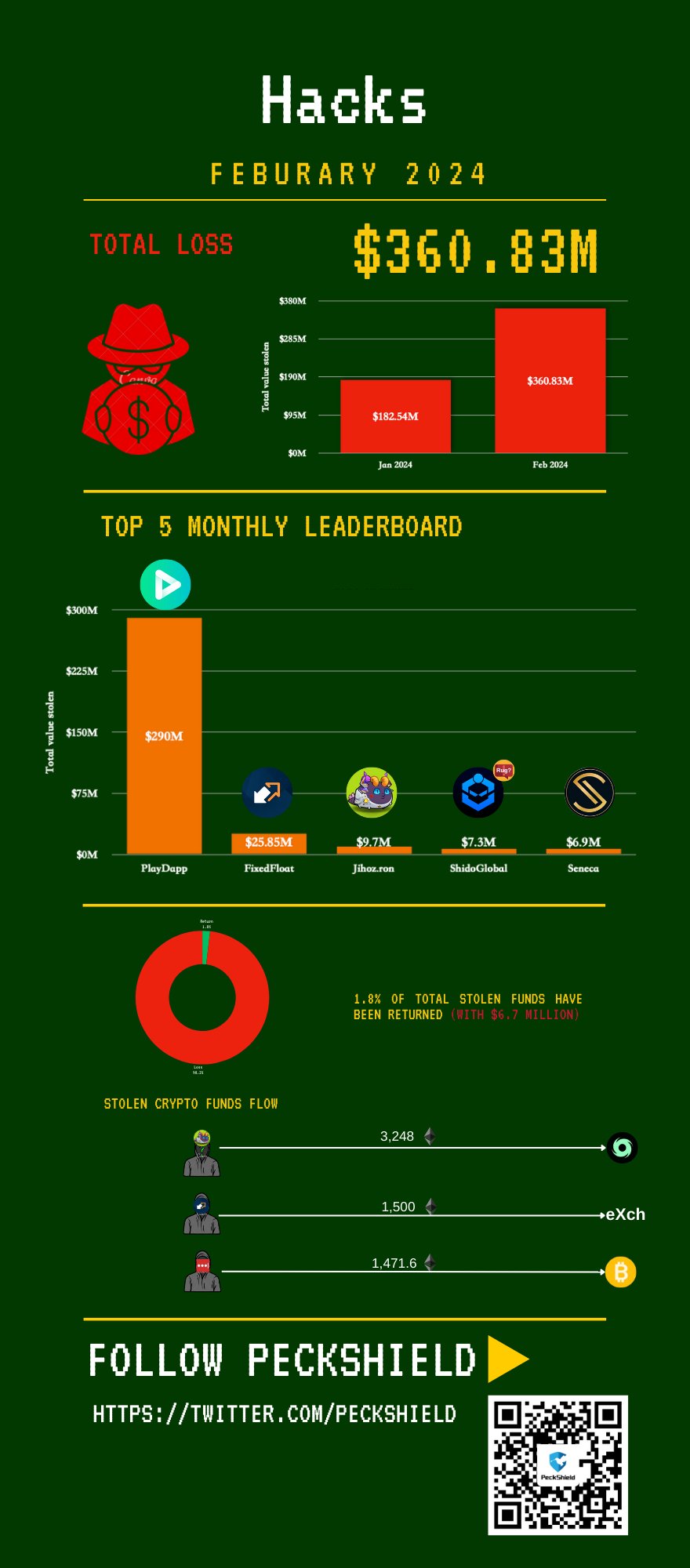 “Hackers stole ~$360.83 million throughout over 21 assaults in February 2024, marking a month-on-month enhance of 97.6% in comparison with January 2024. Moreover, ~1.8% of the stolen funds have been returned, totaling ~$6.7 million.”