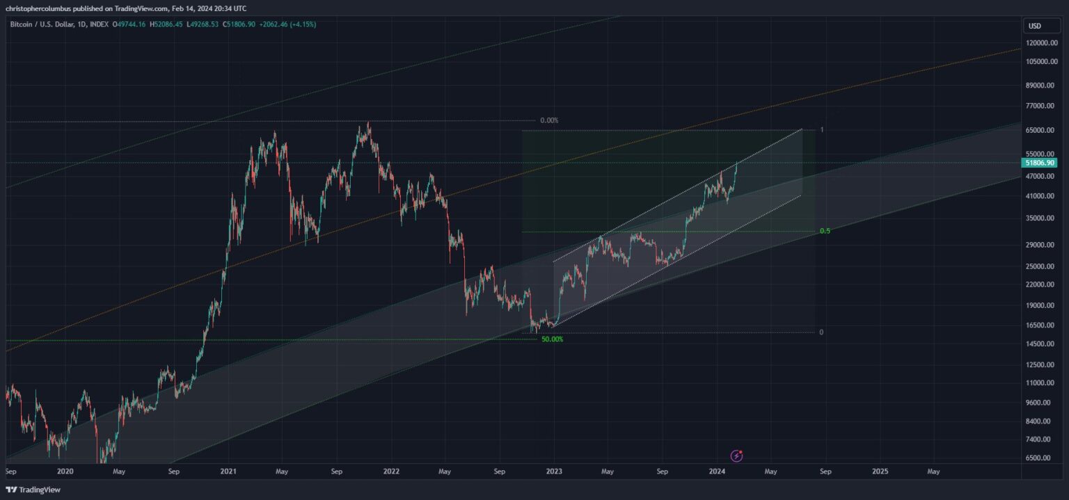 Taking a look at his chart, Dave the Wave thinks BTC simply broke out of a long-term regression band and is subsequently about to interrupt out of a shorter-term overlapping ascending channel. If the breakout fails, the analyst’s draw back goal of $41,000 is on the backside of the ascending channel.