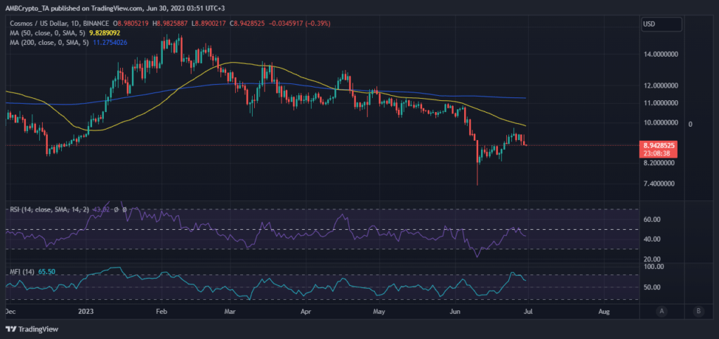 ATOM’s Cash Move Index (MFI) already indicated that the cryptocurrency was experiencing outflows. In the meantime, the Relative Energy Index (RSI) was an excellent indicator for a pivot level because the worth turned bearish after hitting the RSI mid-point (50% degree).