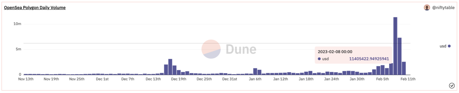 The latest commerce information clarifies the latest enhance in Polygon NFT buying and selling exercise. On February 8, the OpenSea market recorded a buying and selling quantity of $11,405,423, which is greater than half of the $19,686,429 every day quantity of Ethereum. The OpenSea NFT market has reached a 90-day excessive with this value.