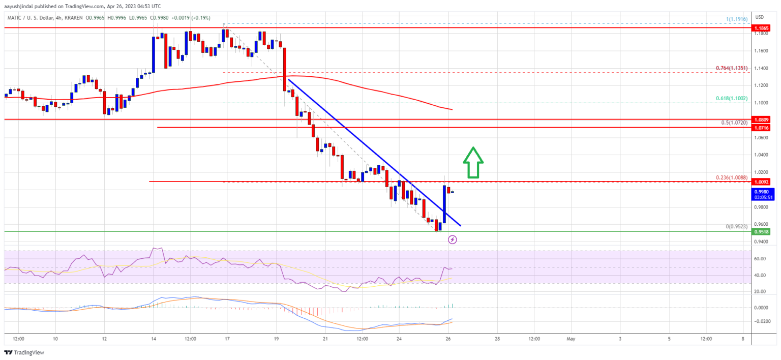 A low is shaped close to $0.952 and the value is now making an attempt a restoration wave, much like Bitcoin and Ethereum. The value was capable of climb above $0.980. Apart from, there was a break above a key bearish development line with resistance close to $0.975 on the 4-hour chart of the MATIC/USD pair.