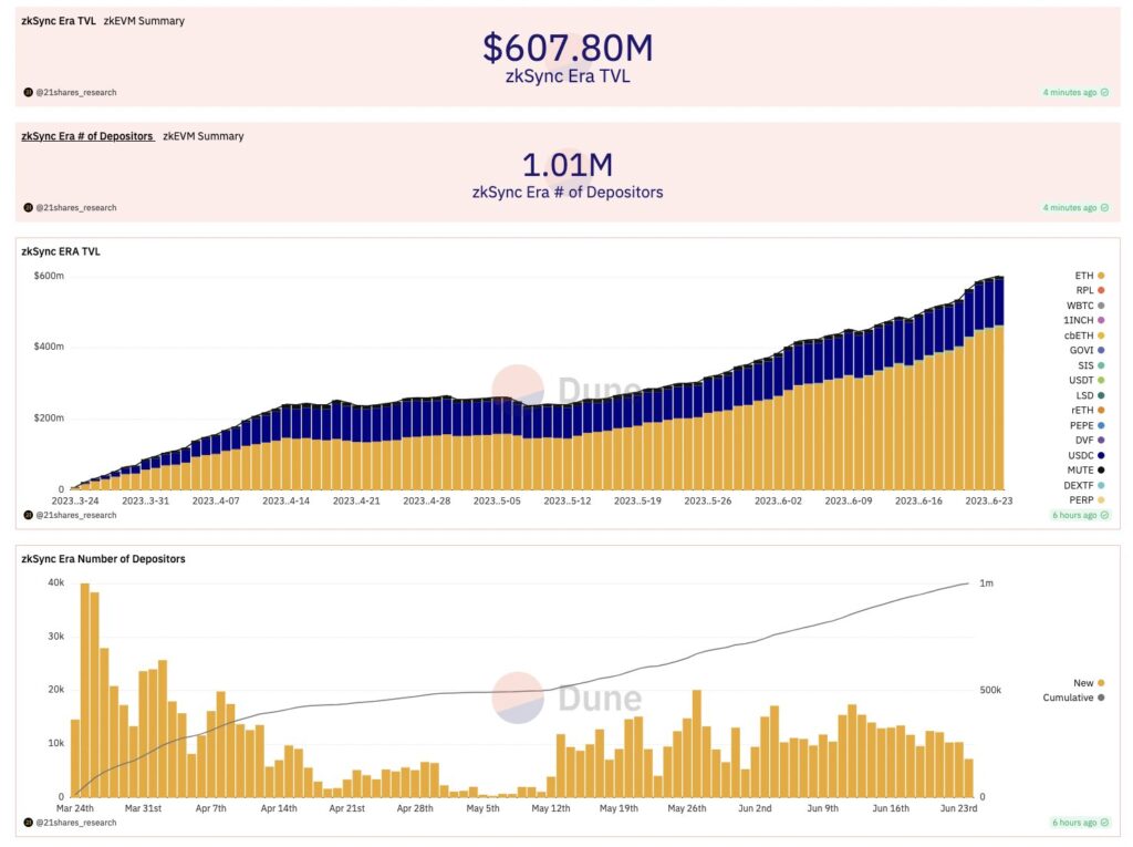 As a consequence of these components, zkSync has achieved a Complete Worth Locked (TVL) of $602 million in belongings locked within the bridge. Alongside, there was a formidable milestone of 1 million distinctive addresses, highlighting rising recognition and consumer engagement.