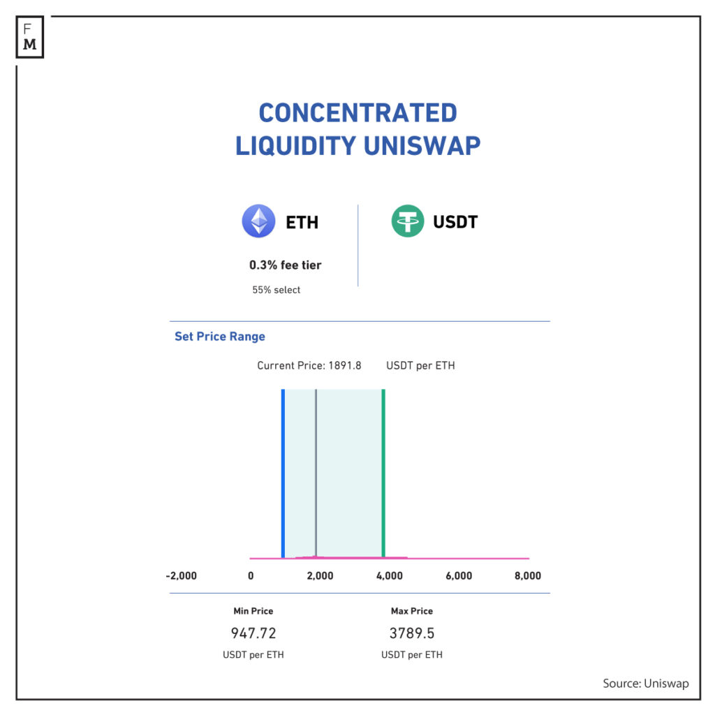 In V2 which was launched in 2020, Uniswap launched ERC-20 buying and selling pairs and Flash Swaps. In V3, concentrated liquidity was added to the protocol. Concentrated liquidity permits allocating liquidity to a value interval. This mannequin improved the usual AMM mannequin.