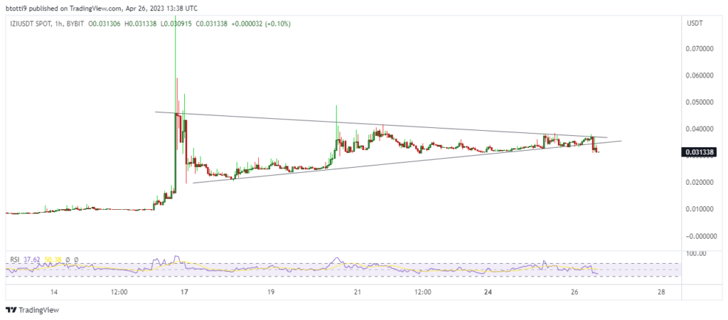 As for fast value outlook, IZI/USD is prone to commerce decrease if bulls fail to maintain $0.030. The hourly chart reveals the token is trending in direction of the oversold territory although and will thus be due an upward flip ought to the $0.02 base maintain. In any other case, a dip to $0.011 may occur.