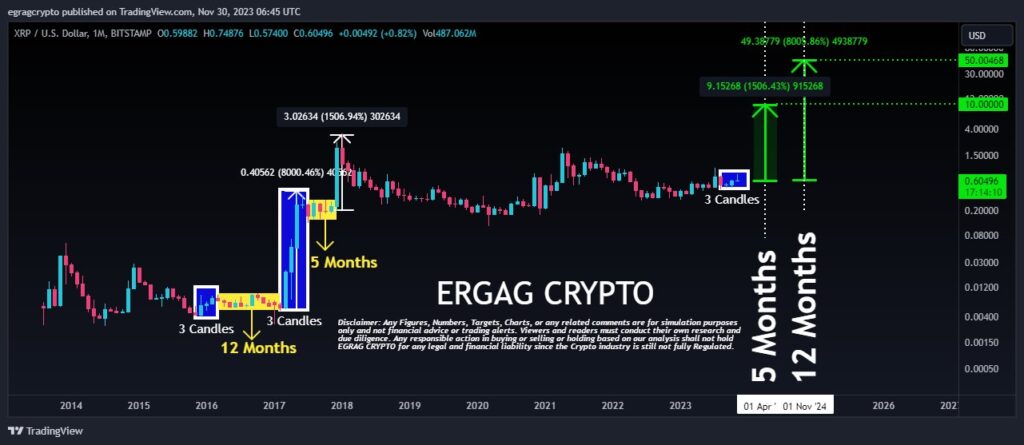 In March 2018, the XRP value began a rare 8,000% rally. A replication of this situation would indicate a possible skyrocketing of XRP’s value to $50, starting on the first of November 2024.