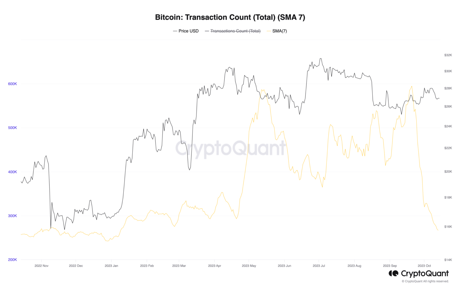 The coin’s transactions rely metric, which measures the distinctive rely of transactions executed on the Bitcoin community, assessed on a seven-day small transferring common, has fallen to its lowest stage since January.