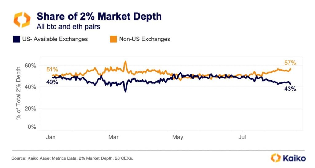 In accordance with a latest report from Kaiko, Bitcoin and Ethereum liquidity within the U.S. witnessed a decline. The information revealed that the portion of liquidity for these property on U.S.-based exchanges decreased to roughly 43%.