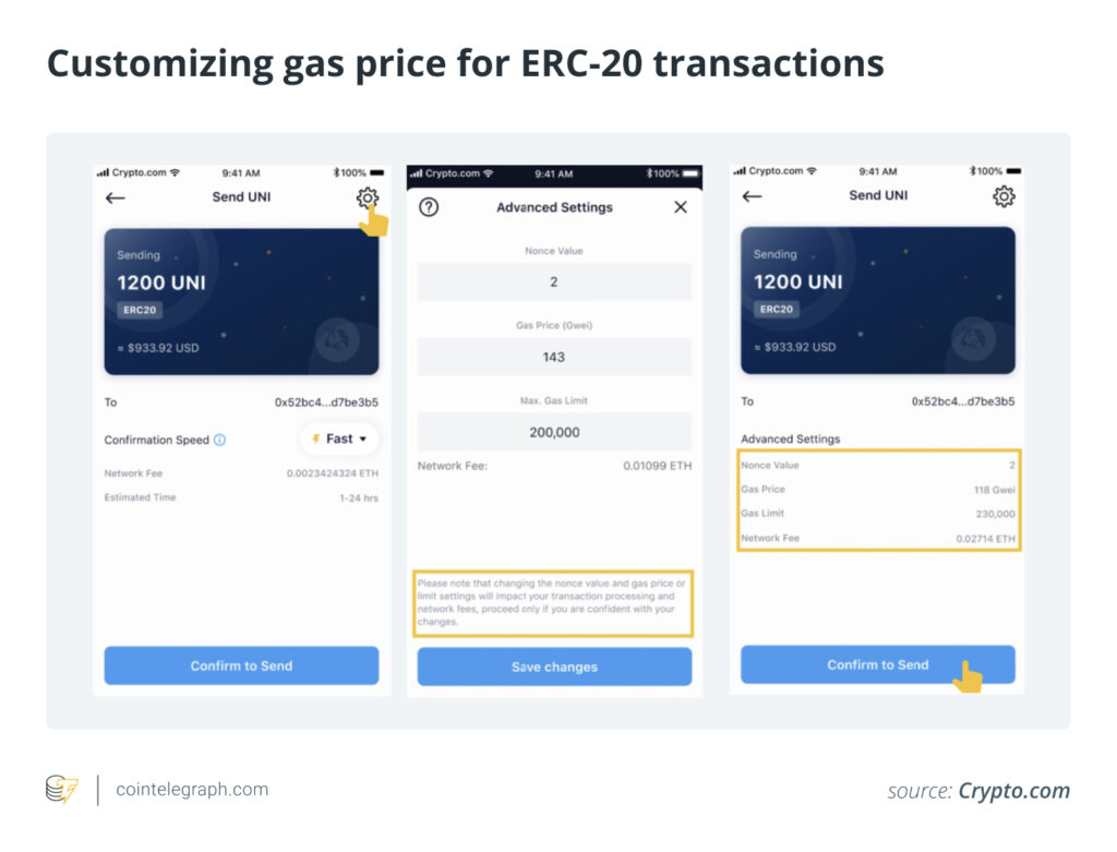 As well as, particular wallets, comparable to Trezor, enable customers to “Bump Price” on pending, unconfirmed transactions. Furthermore, Crypto.com customers can make the most of superior transaction settings to ship Ether (ETH) or different ERC-20 tokens, permitting customization of the nonce worth, gasoline value or gasoline restrict. This function, obtainable in-app model 1.8.2 and above, empowers superior customers to tailor transaction parameters.