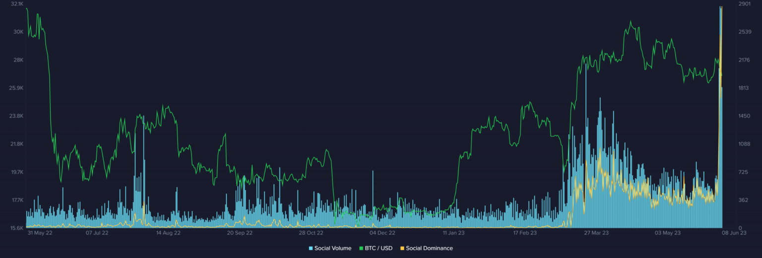 Santiment’s newest report on Could 31 revealed that Ripple skilled a outstanding surge in social quantity, capturing important consideration in on-line discussions. The social quantity chart indicated that on Could 31, there have been practically 3,000 mentions of XRP.