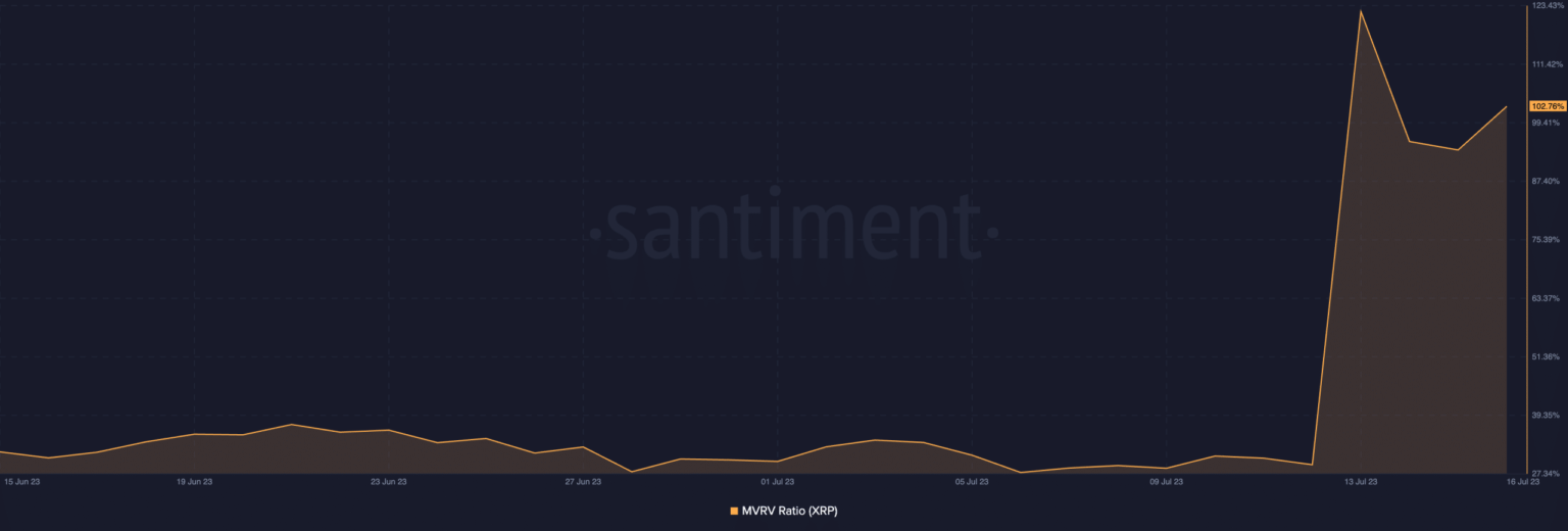 Between 12 and 13 July, XRP’s MVRV worth elevated by over 300%. At press time, this metric was 102.76%. This indicated that, on common, XRP’s present market worth was 102 instances greater than the typical value at which it was final acquired or transacted by its holders. Due to this fact, holders are in a worthwhile place.
