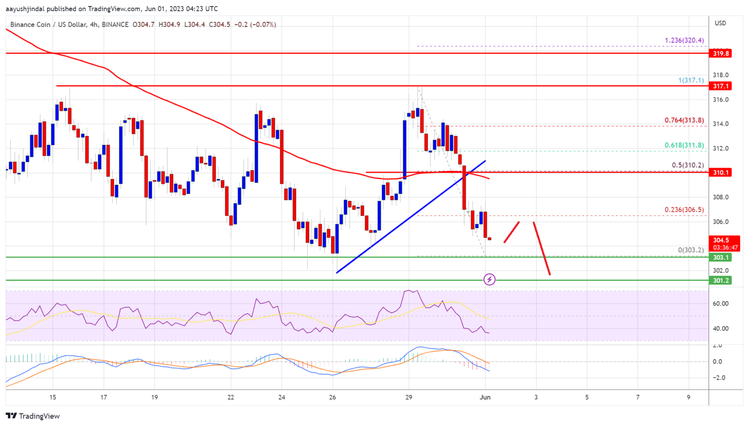 A excessive is fashioned close to $317.1 and the worth began a recent decline. There was a transparent transfer beneath the $312 and $310 ranges. There was additionally a break beneath a key bullish pattern line with assist close to $310 on the 4-hour chart of the BNB/USD pair.