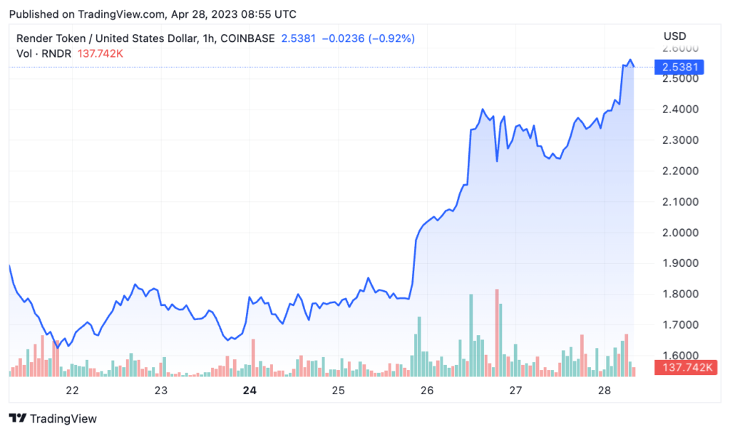 CryptoSlate knowledge signifies that the RNDR token was being traded for round $1.7911 on April 26. As of April 28, the value elevated as excessive as $2.5615 — marking a 43% improve in two days.