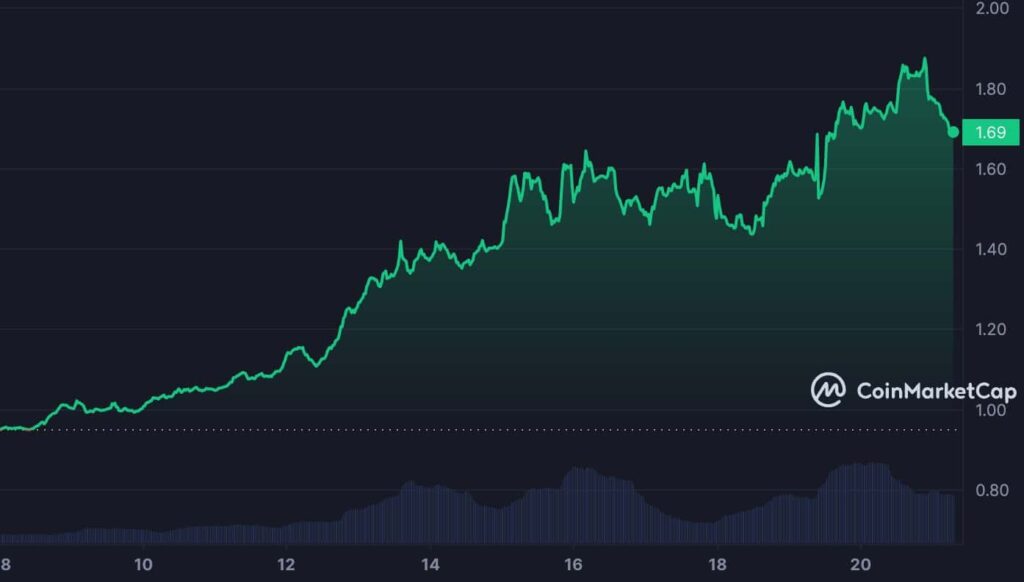 At press time, RUNE traded at $1.69. An evaluation of worth actions on a D1 chart revealed the presence of considerably bullish sentiments amongst each day merchants.
