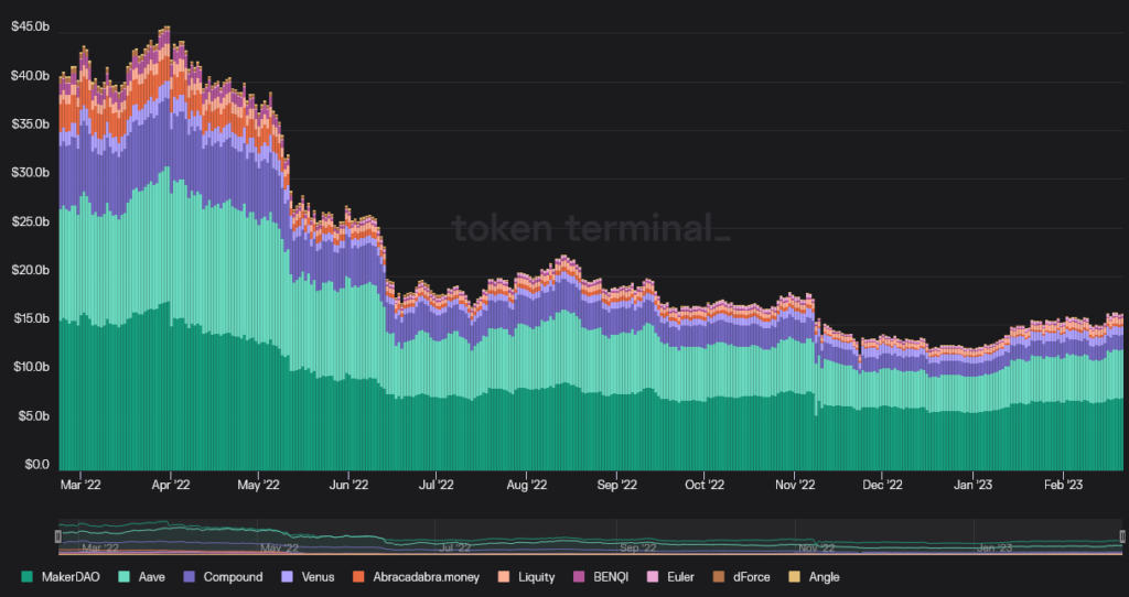 Whereas Complete Worth Locked (TVL) in DeFi lending platforms is trending upward as of this writing, it nonetheless has some technique to go to get better from its pre-crash ranges of $45 billion from April 2022. (The crypto market strikes in tandem.)