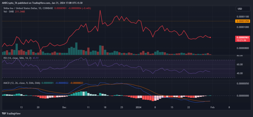 Shiba Inu [SHIB] fell 2.6% over the past 24 hours of buying and selling, because the second-largest meme coin venture’s woes continued in January.