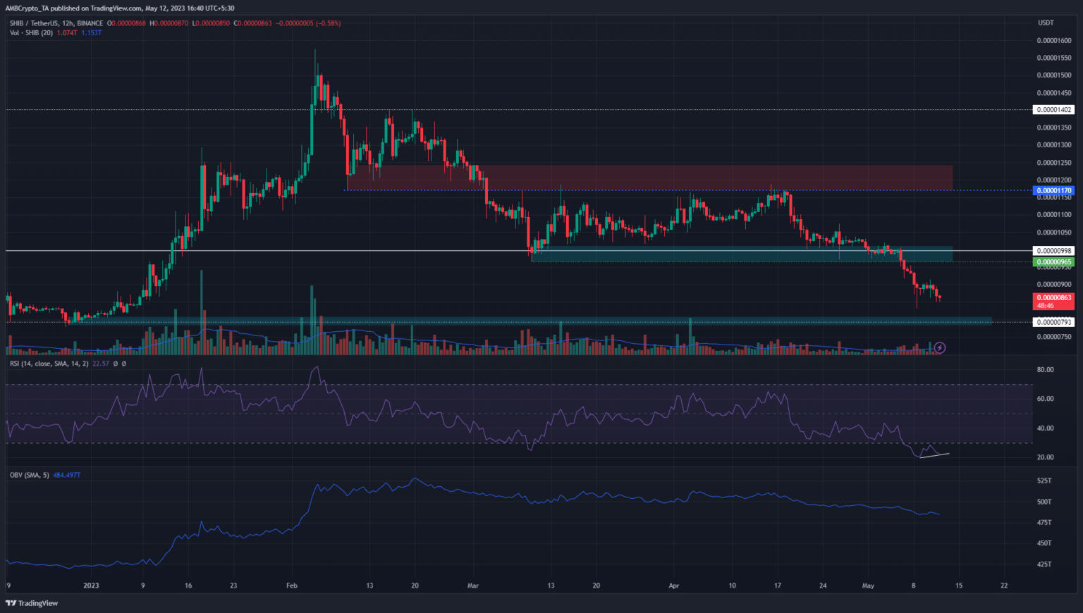 The worth motion on the 12-hour chart left little proof in help of the bulls. The development has been downward since mid-April, after the rejection on the $0.0000117 resistance.