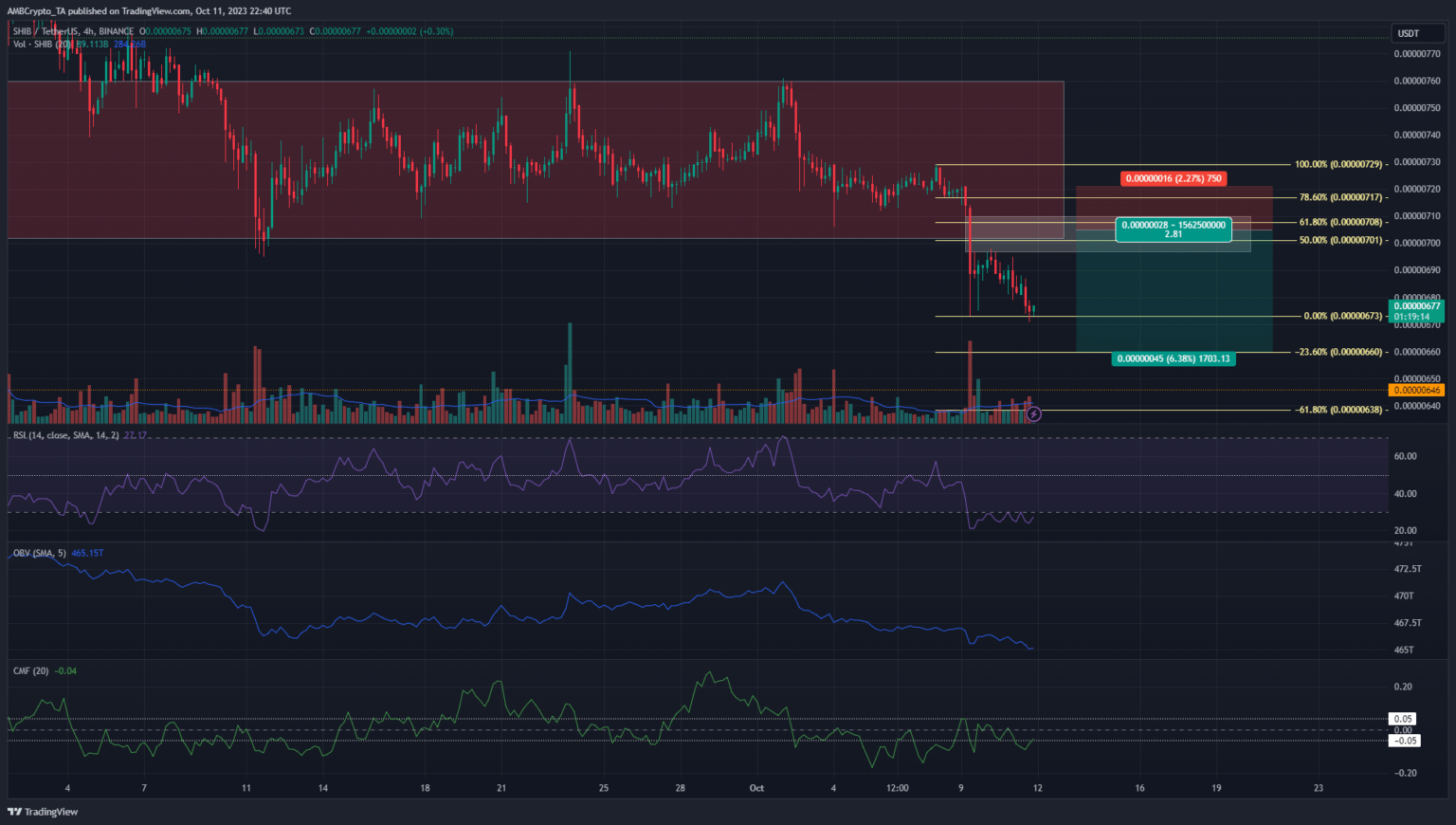 The H4 market construction of Shiba Inu was strongly bearish. The Relative Energy Index (RSI) was at 27 and signaled hefty downward momentum. The On-Steadiness Quantity (OBV) was in a downtrend in October, and the Chaikin Cash Circulation (CMF) has usually dipped under -0.05. This indicated important capital circulate out of the SHIB market.