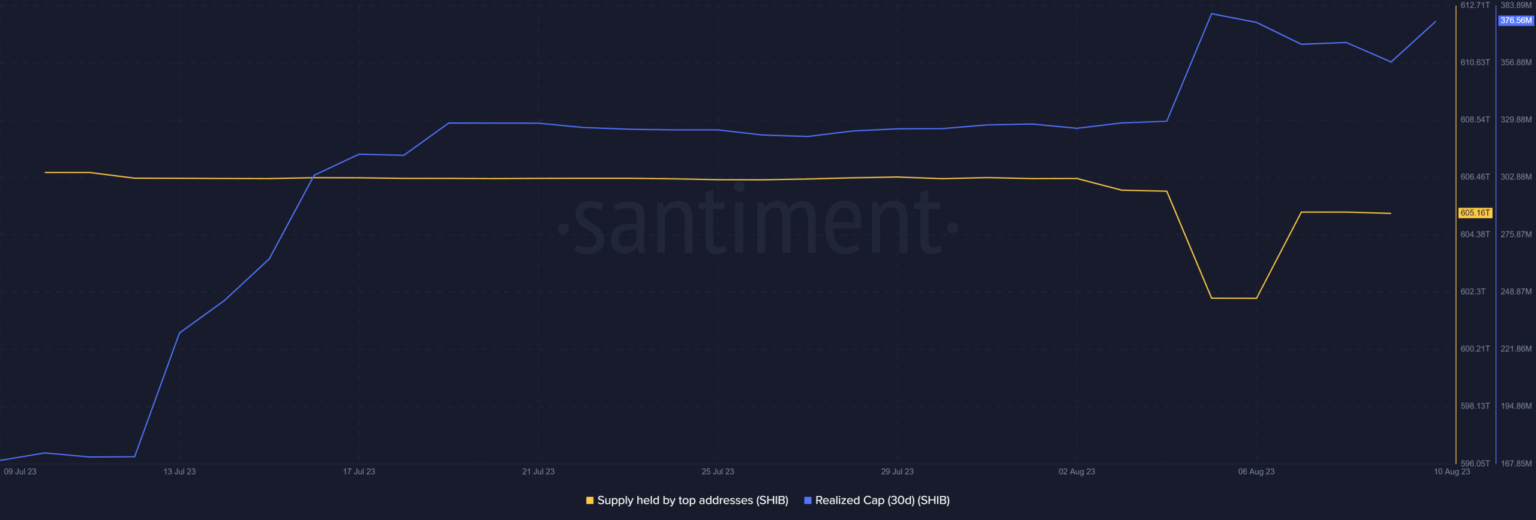Whether or not SHIB will rally or fall below the burden of expectations largely relies on its potential to maintain the bullish momentum. Listed below are some on-chain findings to think about. The provision held by prime addresses was considerably decrease than its place at first of August.