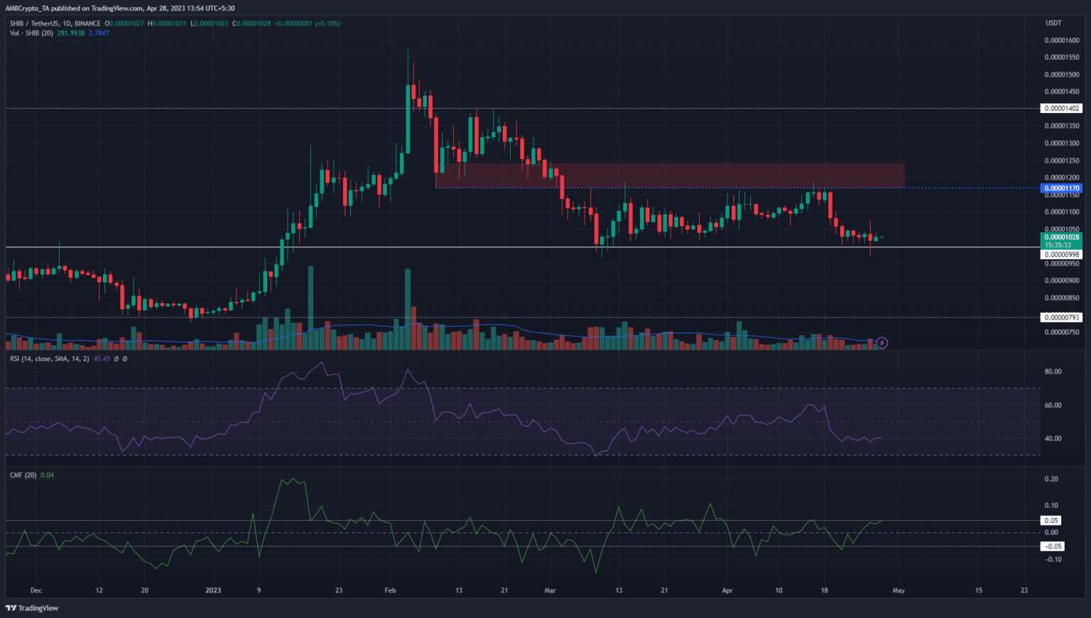 This space had been a bullish order block, however it was damaged on 2 March. Since then, it has served as a robust resistance zone. SHIB bulls have been unsuccessful in breaching this area over the previous two months.