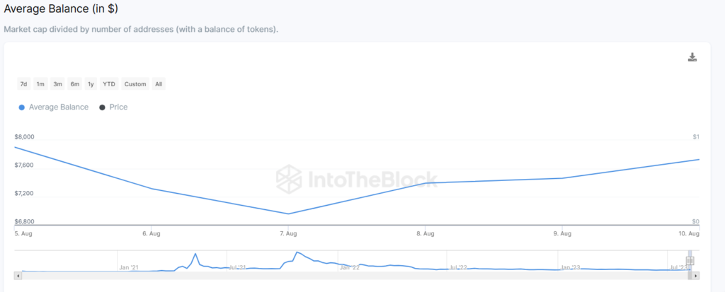 Knowledge from Into The Block reveals that the common stability held by addresses has seen a noticeable improve over the previous three days. The typical has jumped from $6,959 to $7,728 as of 10 August. This means a rising pattern in SHIB accumulation, doubtlessly in anticipation of an upcoming bull run.