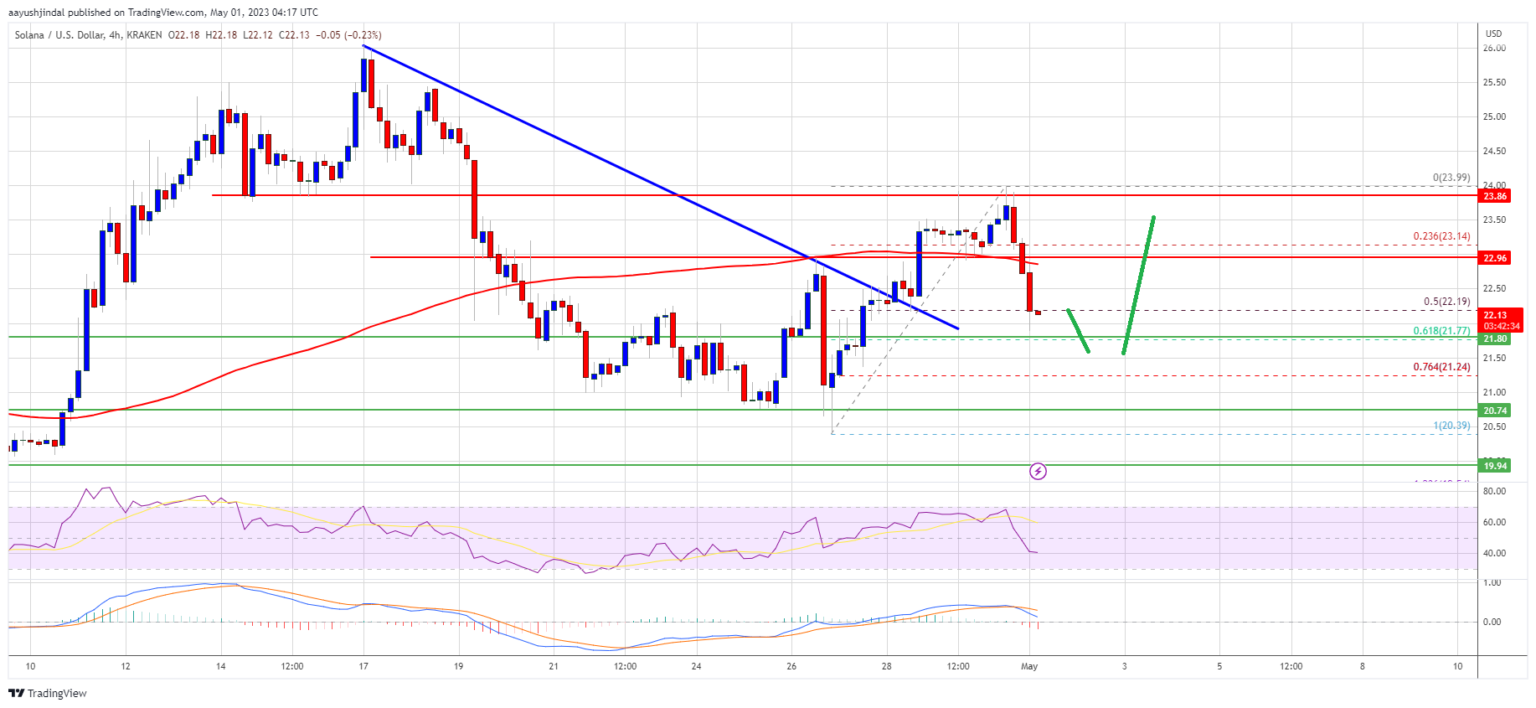 Solana began a draw back correction from $24 towards the US Greenback. SOL worth would possibly begin a recent enhance if it stays above the $21.50 help.