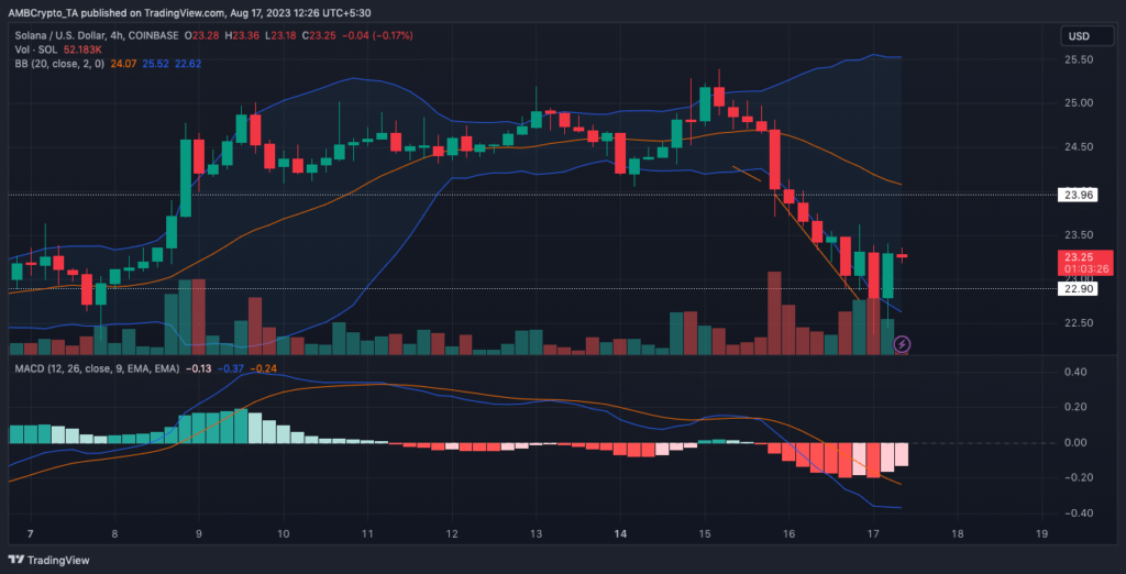 As of 15 August, SOL tried to carry assist at $23.96. However sadly, there was little to no shopping for strain to curtail the growing sell-off. Thus, this led the assist all the way down to $22.90.