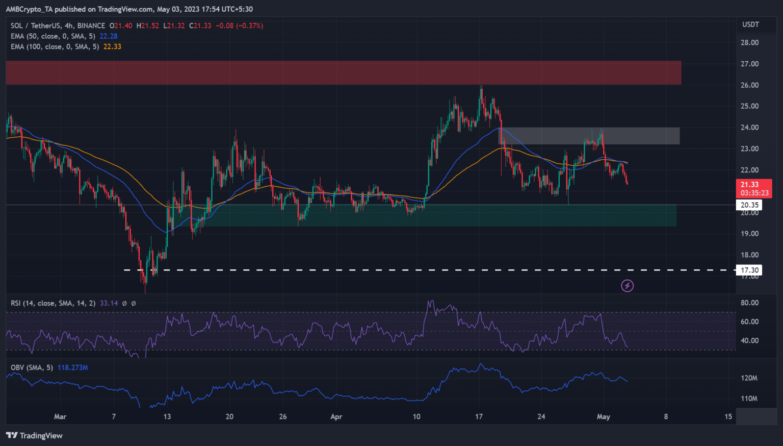 If BTC drops under $28k following the FOMC announcement, SOL may plunge additional and retest the every day timeframe bullish order block and help zone of $19.34 – $20.40 (cyan).