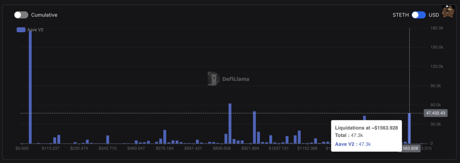 DefiLlama knowledge reveals that within the stETH market of Aave v2 if the value of stETH falls to $1563.928, 47,300 stETH (about $78 million) might be susceptible to liquidation. The present value of stETH is $1650.