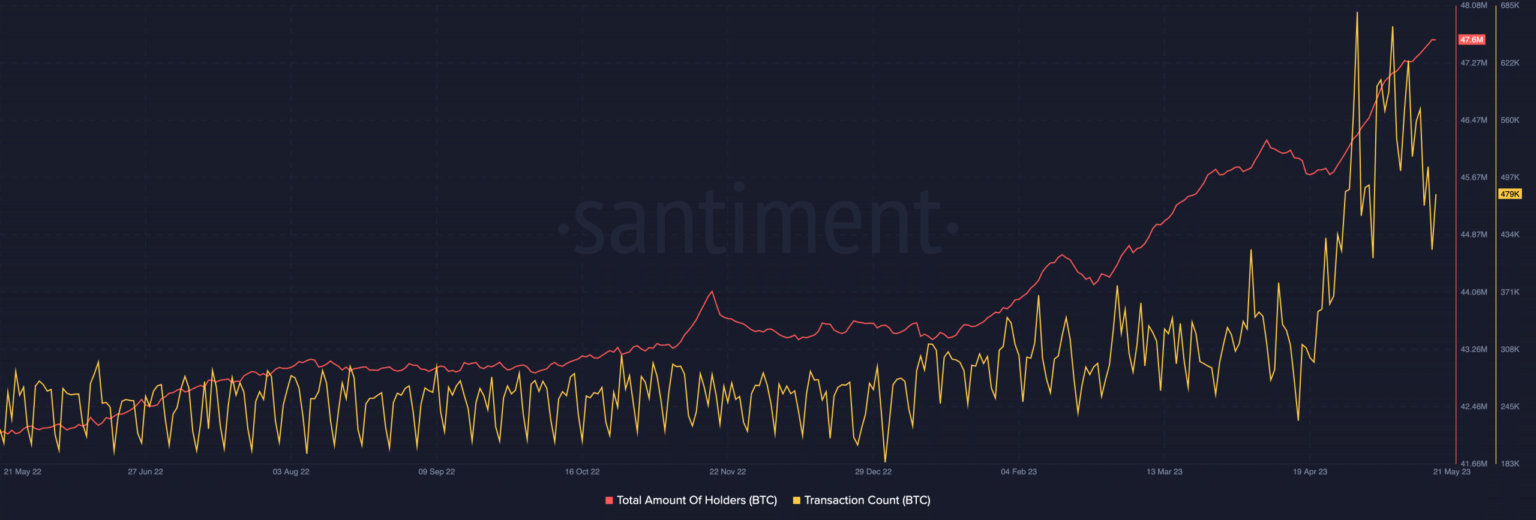 Nevertheless, there have been some optimistic happenings in BTC because the final Pizza Day. In response to Santiment, the full variety of holders one yr in the past was 42.08 million.