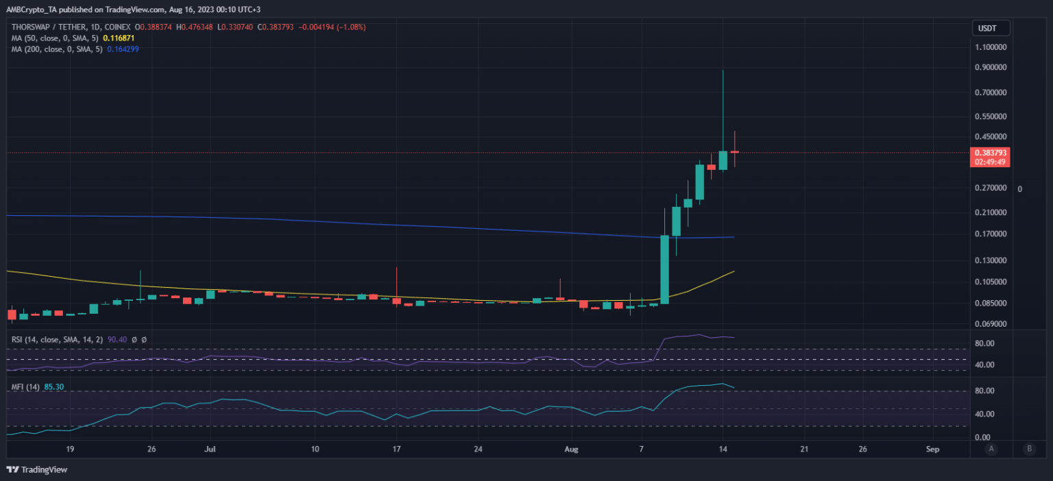 THOR exchanged palms at $0.38 at press time, after pulling again from its peak of 14 August. Some promoting strain was anticipated because the worth was already deep in overbought territory. Regardless of that, the press worth nonetheless represented a 400%+ acquire from its current month-to-month low.