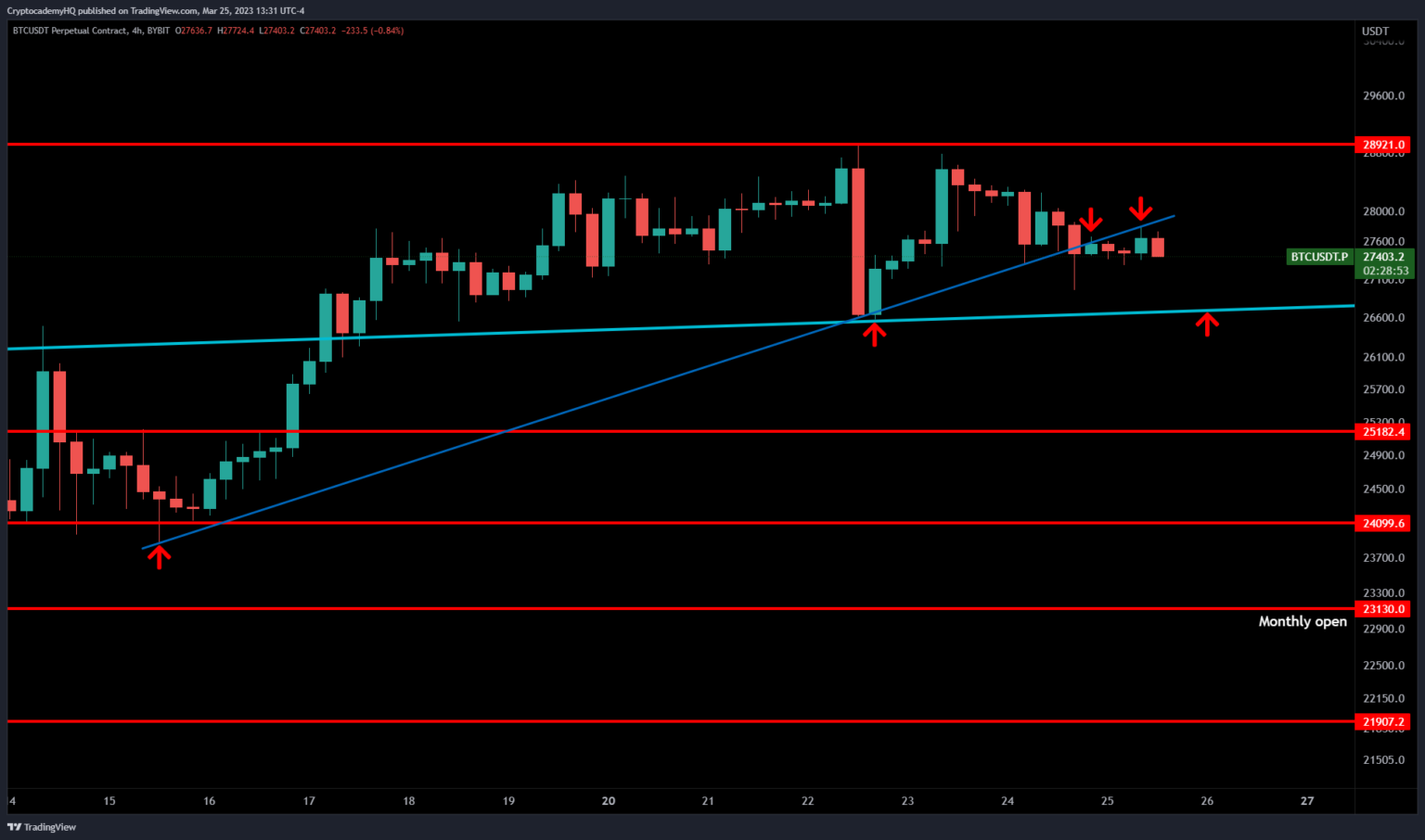 “If BTC loses $26,500 on the excessive timeframes, it will go down as the obvious quick entry that almost all of crypto Twitter missed as a result of they have been promised $1 million Bitcoin in 90 days.”
