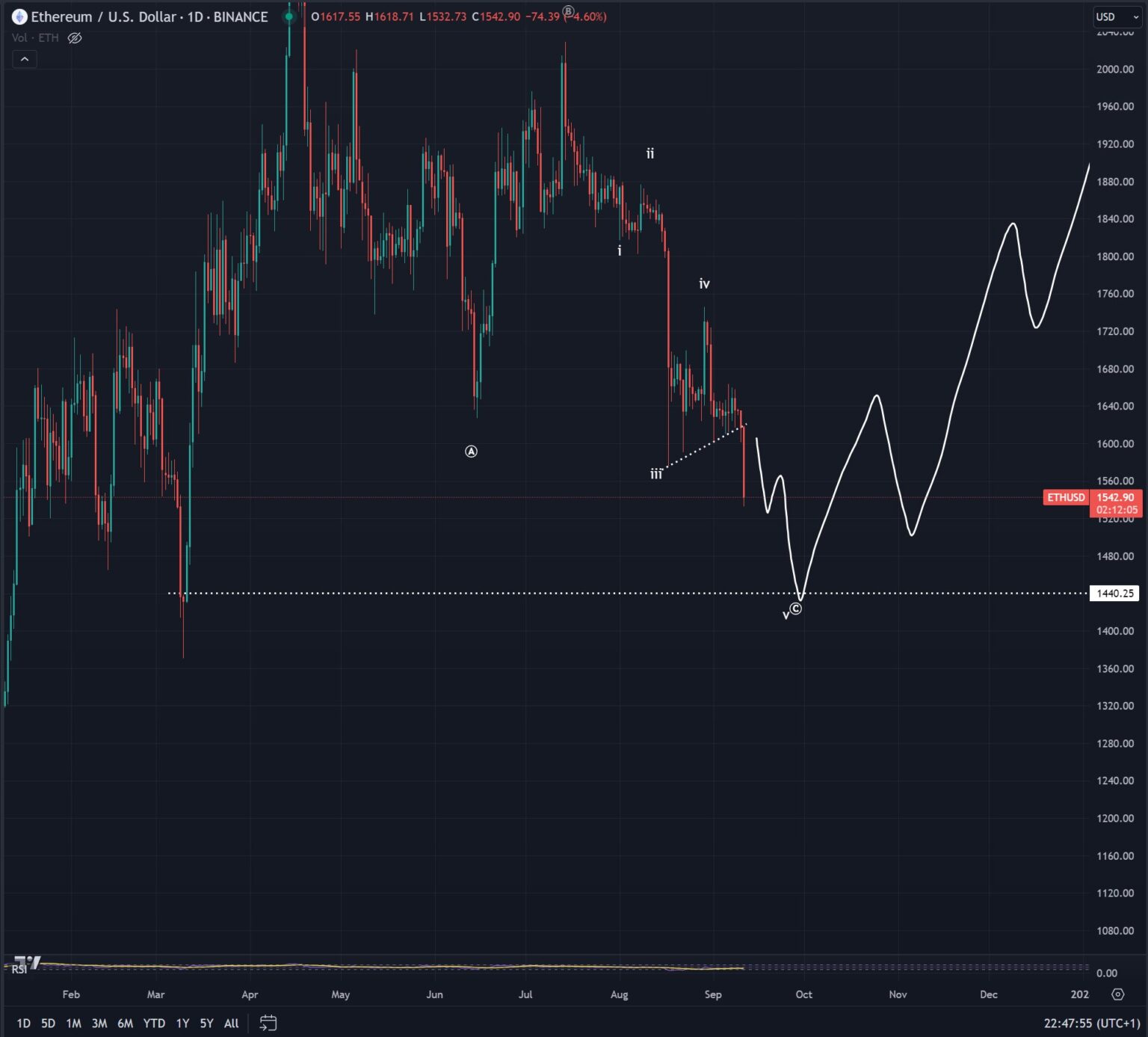 Trying on the dealer’s chart, he seems to foretell that the fifth and remaining wave of the correction will finish at $1,440. Nevertheless, Bluntz warns that his wave depend can be invalidated if ETH manages to bounce to $1,622 earlier than hitting his draw back goal.