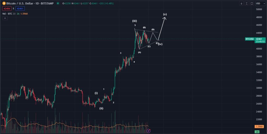 The dealer shares a chart that reveals BTC breaking out of the sample and rallying to about $48,000.