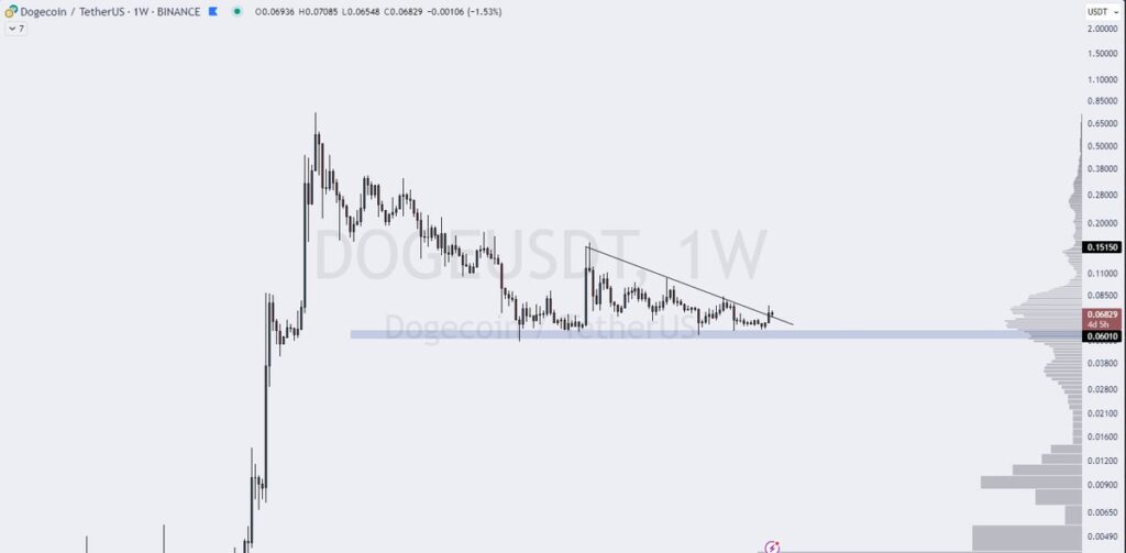 Pseudonymous dealer The Movement Horse tells his 183,000 followers on the social media platform X that he believes DOGE has quite a lot of upside potential after shifting above its diagonal resistance on the weekly chart.