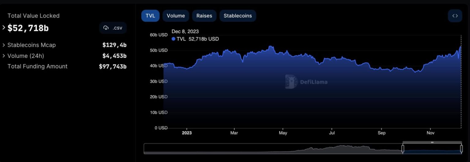 Notably, the Whole Worth Locked (TVL) in DeFi is again to yearly highs of 2023 at $52.71 billion. Finbold retrieved this information from DefiLlama on December 9. The 24-hour quantity was $4.45 billion by press time, and the full funding quantity was $97.74 billion.