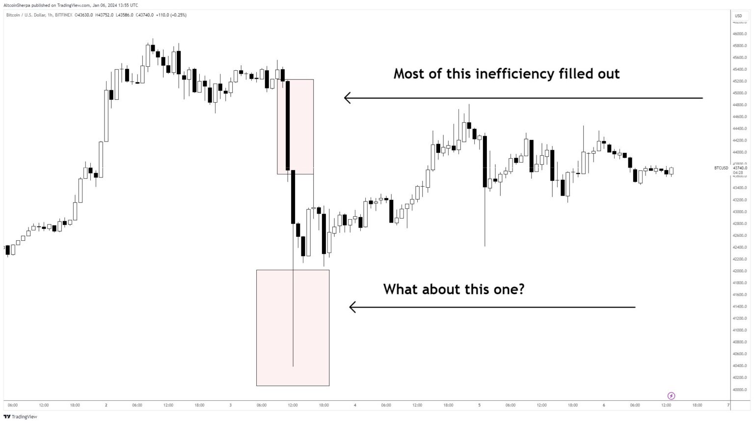 Taking a look at Bitcoin (BTC), Altcoin Sherpa says that some “inefficiency,” or areas with excessive volatility and sure weakly held positions, could should be retested within the close to future. He targets roughly the $40,000 degree.