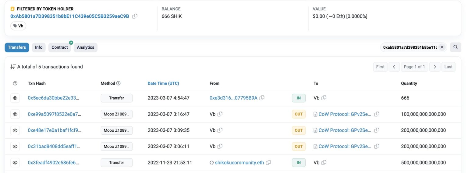 – Transferred 10 trillion SHIK (~26 ETH)