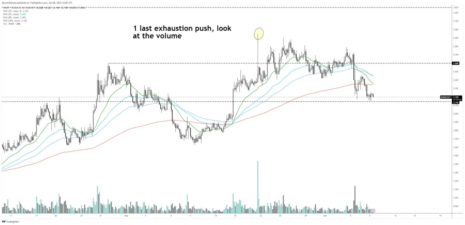 Pseudonymous dealer Altcoin Sherpa tells his 195,900 Twitter followers that the current uptrend of the blockchain-based rendering protocol Render (RNDR) seems to be over for now.